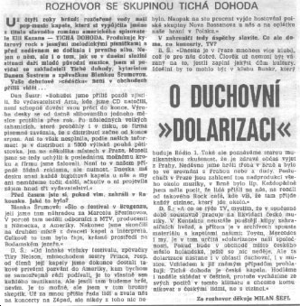 D. Š.: "A co se týče TV, myslím, že v současné době soustavně pracuje na likvidaci české muziky. V Kontaktu neustále pouštějí klipy zahraničních hvězd, a přitom je v archivech spousta materiálu s kapelami našimi: Toyen, Mercedes i my. Je v tom určitá "dolarizace" naší společnosti. Pokud bude v obchodě místo českého másla holandské, ještě se nic neděje. Ale ta dolarizace nastane i v oblasti duchovní, i v muzice. Vzhledem k již známým případům prohlašuji: Tichá dohoda je česká kapela. Hodláme i nadále skládat v češtině, protože vycházíme ze svých pocitů v tomto klimatu a chceme komunikovat s českými lidmi, ne s cizinci."